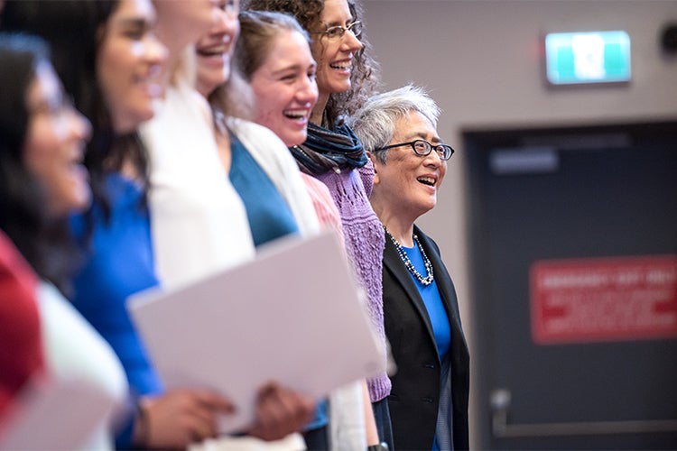 Carol Chin sings alongside U of T’s Spirit Singers to close the ceremony marking her installation as principal of Woodsworth College (photo by Lisa Sakulensky)