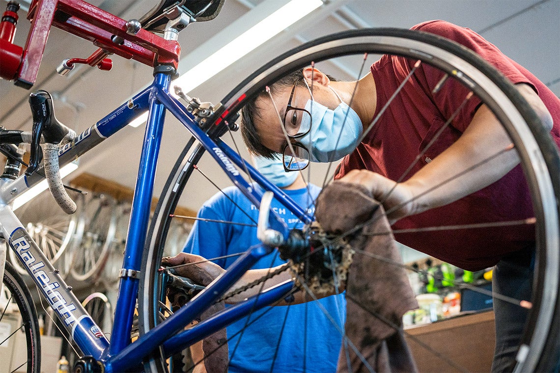 Bo Huang, a graduate of the Rotman School of Management, fixes his bike at Bikechain, a campus cycling co-op on the St. George campus (photo by Geoffrey Vendeville)