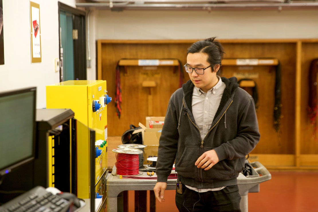 Sessional lecturer Zhe Gong looks over the components that make up the electric vehicle lab station in the Faculty of Applied Science & Engineering’s Energy Systems Lab (photo by Matthew Tierney)
