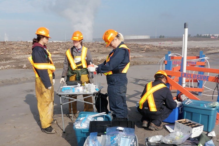 Lesley Warren (standing, at right) and her colleagues are mining the genomes of microbes that thrive in wastewater generated by the resource extraction industry (photo courtesy of Lesley Warren)