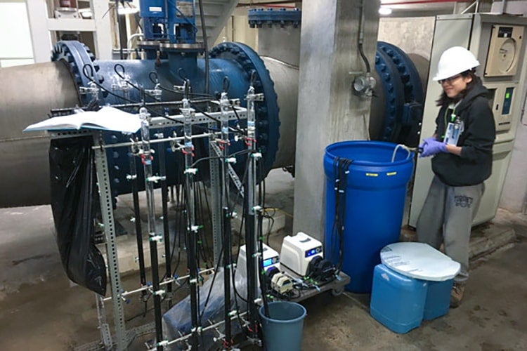 Zhjie Nie takes a sample at a Toronto-area drinking water treatment plant for her project on using activated carbon to remove contaminants (photo by Ron Hofmann)