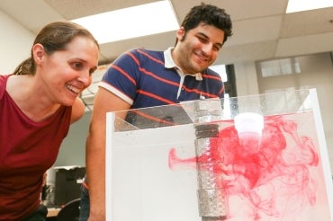 Jennifer Drake and her students research ways to design our urban infrastructure to be resilient to storm surges, including this catchbasin shield that can capture sediments from stormwater runoff (photo by Pavneet Brar)
