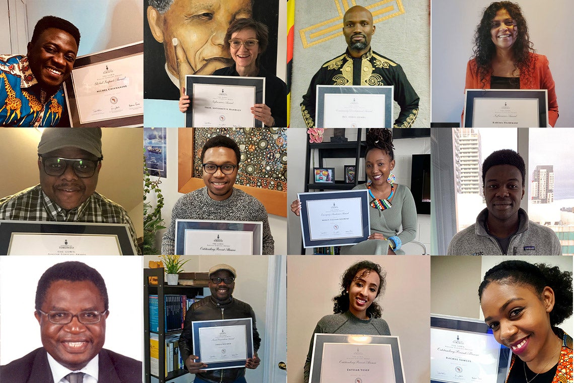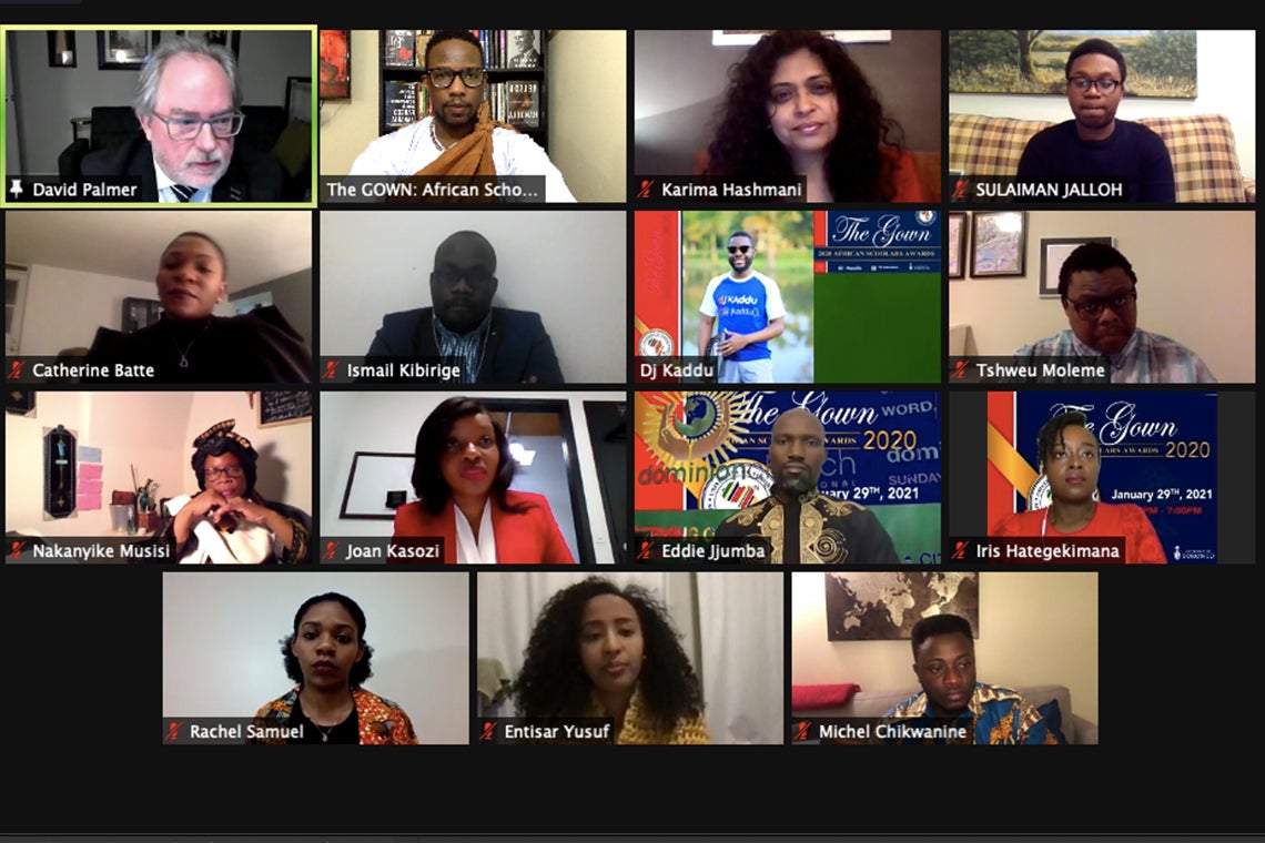 David Palmer (top row, far left), U of T’s vice-president, advancement, and Henry Ssali (top row, second from left), who works in the president’s office and is the founder and executive director of the African Alumni Association, are joined by recipients of this year’s African Scholars Awards (image via Zoom)