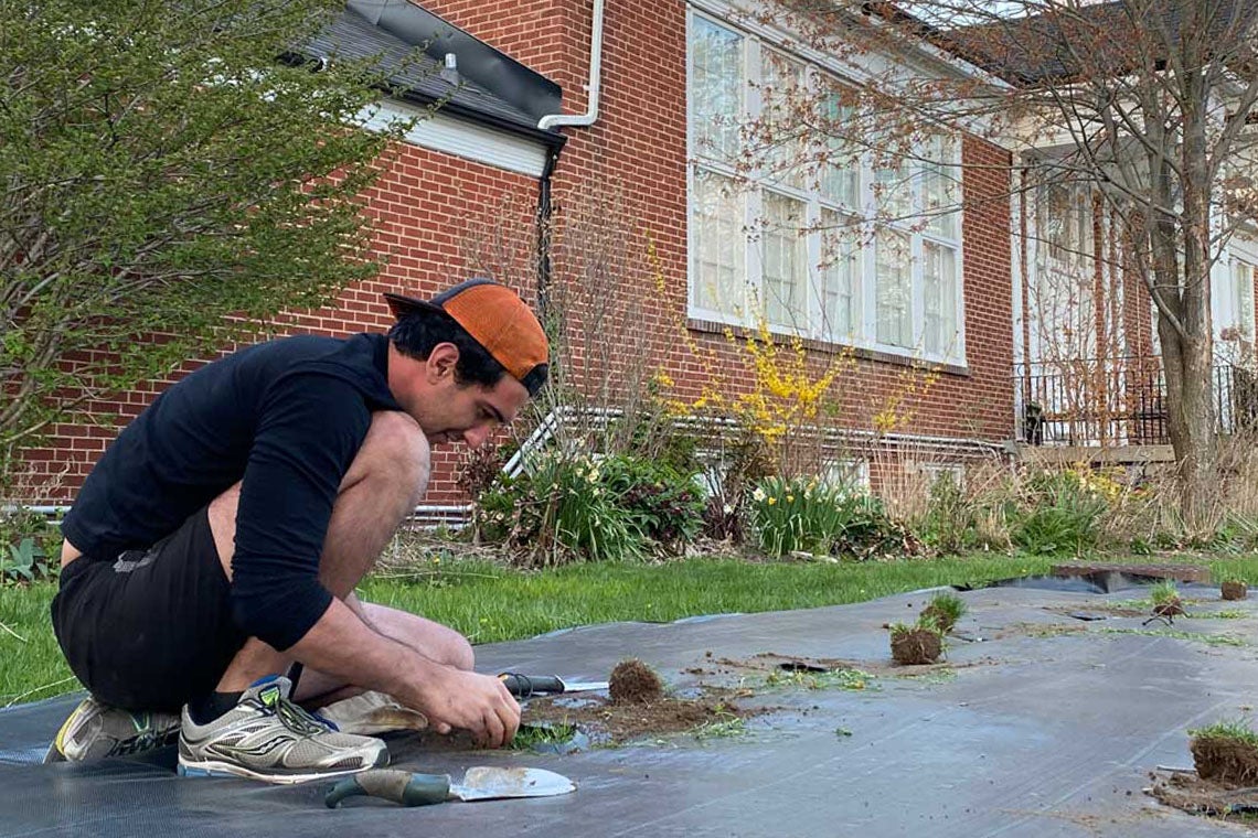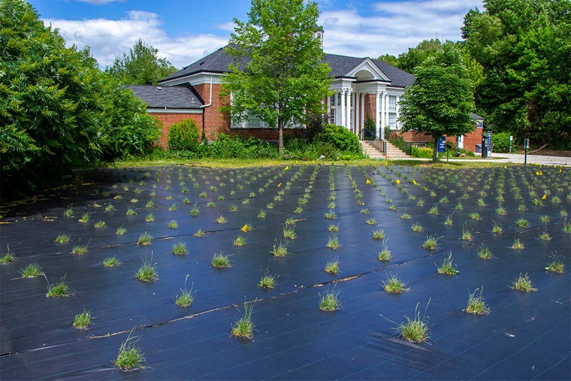 An unusual garden at U of T Mississauga is drawing inquiries from curious passers-by. The green lawn between Alumni House and Mississauga Road has been covered with black landscape fabric and dotted with more than 450 white clover plants.