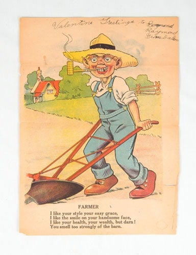 Cards in the collection range from humorous – "I like your health, your wealth, but darn! You smell too strongly of the barn" – to ornate (photo by Laura Pedersen)