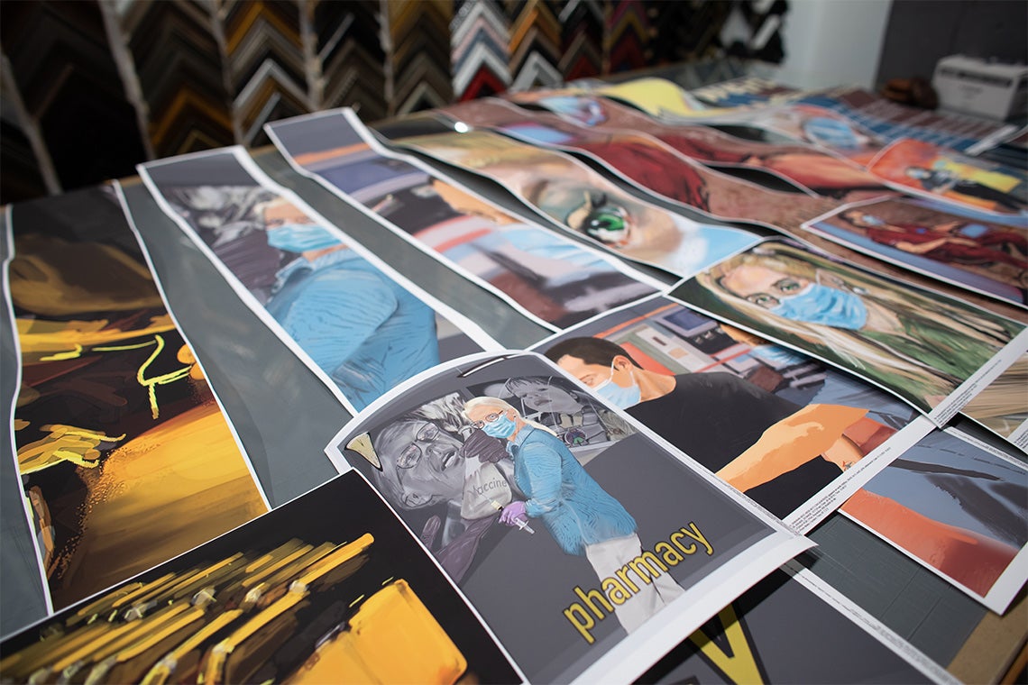 “When we started, no one was vaccinated. The workers were exposing themselves to the public every day, which was not without risk,” she says. “I think his artwork really captures the essence of our work and the experience.”