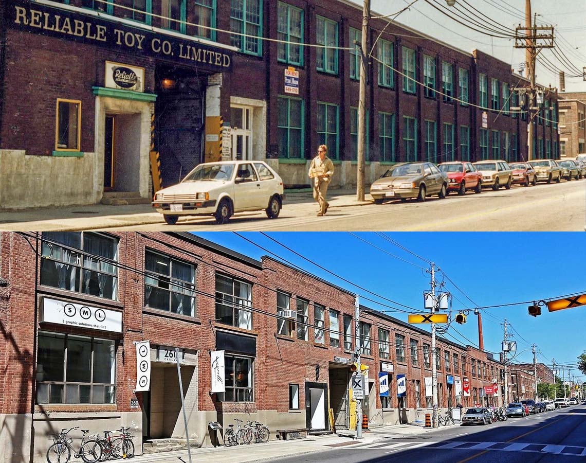 The Reliable Toy Company's former home in Leslieville was researched as part of the Hidden Histories project (photos by Toronto Public Library and Urban Landmark Realty)