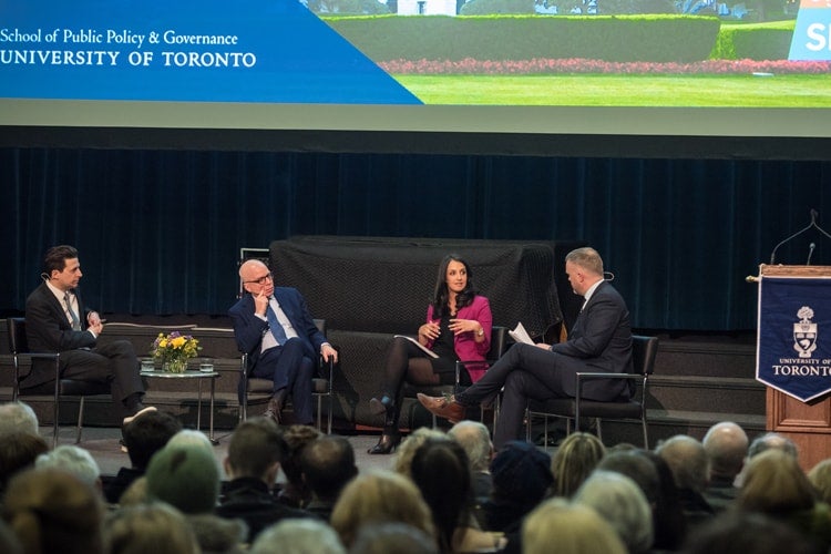 Michael Wolff (second from left) was joined in the discussion by (from left to right) Professor Joseph Heath, Ottawa reporter Althia Raj and SPPG director Peter Loewen