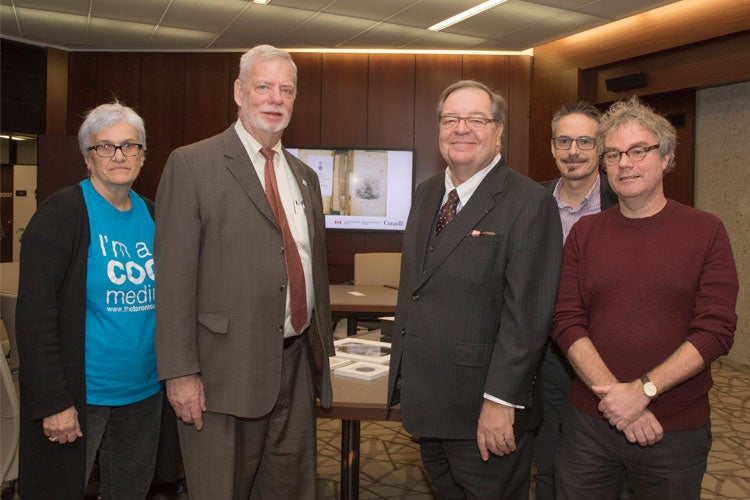 (From left) Wendy Duff, dean of U of T's Faculty of Information, Larry Alford, Guy Berthiaume, Robert Fisher of Library and Archives Canada, and John Shoesmith, U of T librarian, at the UNESCO announcement event (photo by Romi Levine)