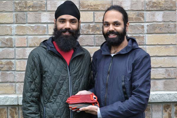 Ameek Brar (right) and his brother Ameer display their startup's glove designs