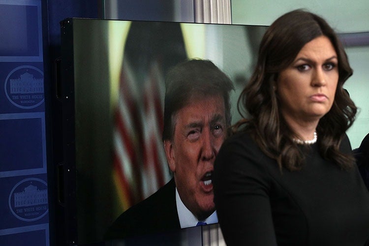 U.S. President Donald Trump speaks via video as White House Press Secretary Sarah Sanders listens during a daily news briefing at the White House on Thursday, Jan. 4. Sanders spoke on various topics including the new book Fire and Fury, written by Michael Wolff (photo by Alex Wong/Getty Images)