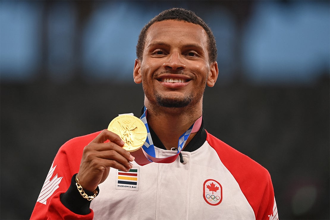 Canadian federal funding in sport is associated with more medals for Olympians like Andre DeGrasse, gold medalist in the men's 200-metre sprint at the Tokyo 2020 Olympic Games, and reduced participation in sport among recreational athletes, according to U of T researchers (photo by Ina Fassbender/AFP/Getty Images)