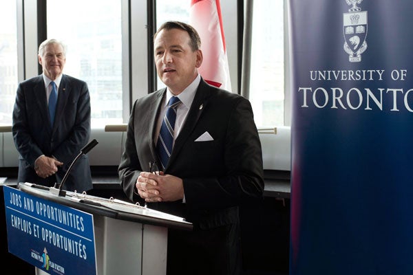 Other speakers at the announcement included U of T alumnus Mark Adler, MP for York Centre; U of T alumnus Chad Gaffield, president of the Social Sciences and Humanities Research Council; and Feridun Hamdullahpur, president and vice chancellor of the University of Waterloo and vice-chair of the U15 group of Canadian research-intensive universities.