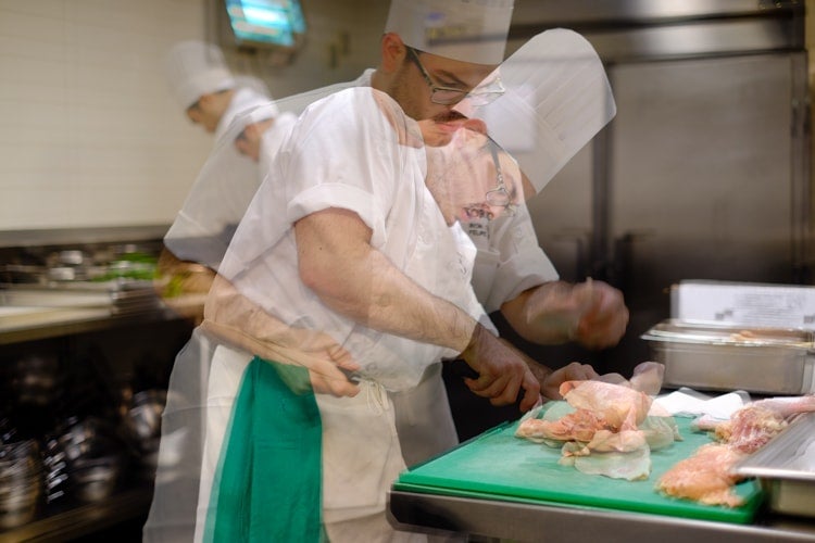 A multiple exposure of Felipe Branco, an M.B.A. student at Rotman, butchering chicken (photo by Geoffrey Vendeville)
