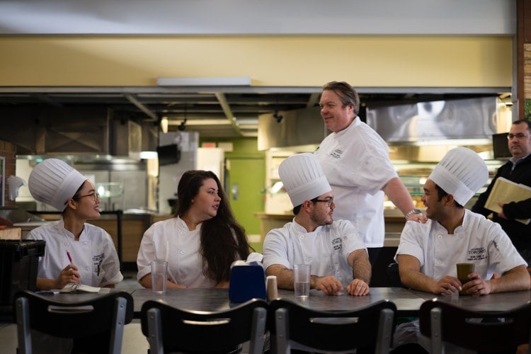 “Why do you look so serious?” Chef Jaco Lokker (centre) says, as he strides past students (from left to right) Ailin Xi, Brettany Colette, Felipe Branco and Jordan Su (photo by Geoffrey Vendeville)