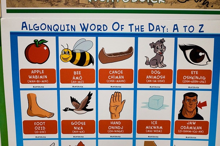 There is also work by Jay Odjick, an Algonquin artist and writer, who is known for sharing Indigenous vocabulary lessons over social media. His Algonquin word-of-the-day charts show how to say and pronounce basic words, from apple to dog and more.