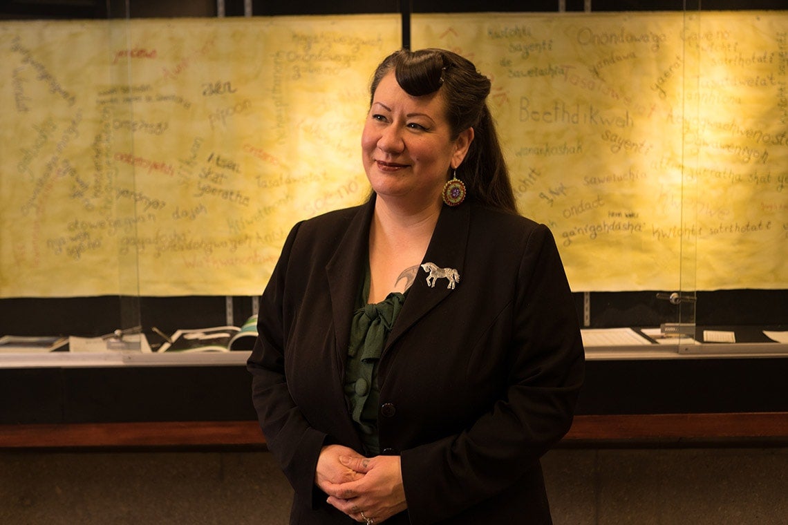 Before entering the stacks, library visitors can see the work of First Nations artists and Indigenous materials on display until April 27, all of which promote local Indigenous languages including Kanien'kéha (Mohawk), Anishinaabemowin (Ojibwe), Wendat and Onöndowa'ga:’ gawë:nö’ (Seneca).