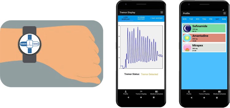 ParkinSense is a medical monitoring system that uses wearables to provide detailed, real-time data on the symptoms of Parkinson’s disease. It can be used to objectively determine the effectiveness of treatment. (Image courtesy of ParkinSense)