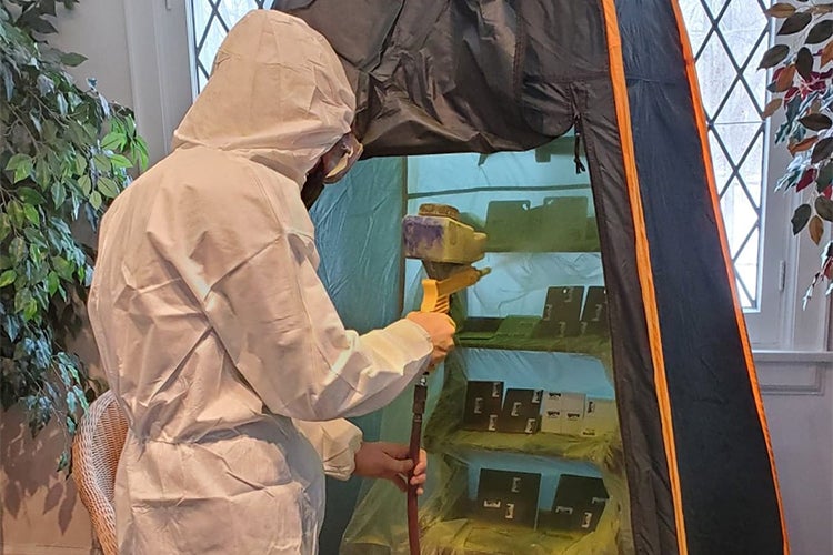 Her research took place in early February at the Crime Scene House, a campus facility for practicing forensic science investigation and documentation techniques. There, she used a gravity-feed sandblasting gun powered by an air compressor to spray fluorescent yellow cornstarch powder over each sample. Cornstarch is a proven substance for fingerprint development that is much more affordable and readily available than regular fingerprint powder. It is also less toxic, making it safer for aerosolized application.