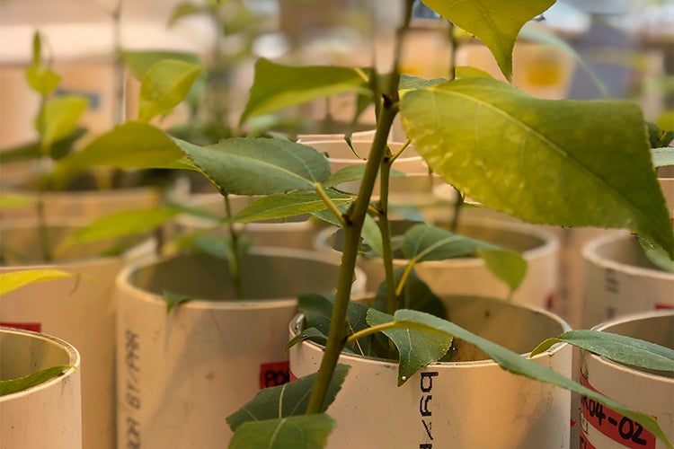 Poplars grow for between five to 10 years before they flower, which is necessary to make the seeds that produce the next generation. But Braeutigam takes cuttings from her trees and propagates them under controlled conditions at U of T Mississauga’s research greenhouse before transplanting them outdoors.
