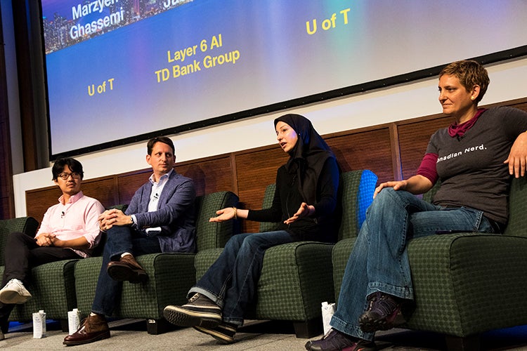 U of T Assistant Professor Marzyeh Ghassemi speaks on a panel discussion about AI. She is joined (from left to right) by U of T Assistant Professor Jimmy Ba, Layer 6 AI co-founder Jordan Jacobs, and Inmar Givoni, who completed a PhD at U of T and is now a senior autonomy engineering manager at Uber (photo by Chris Sorensen)
