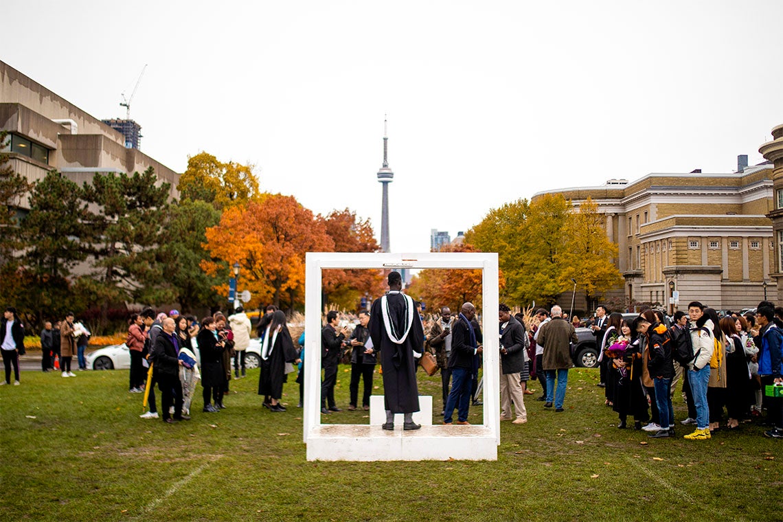 Gown distribution and marshalling will take place in the north end of the Convocation Plaza. There will be a separate and fully accessible entrance in the northwest corner of the tent. The graduate procession will walk on King’s College Circle from the marshalling area to the front doors of Convocation Hall.