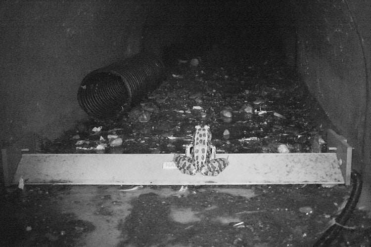 A Leopard Frog uses a tunnel to safely cross under a roadway (photo courtesy of Toronto and Region Conservation Authority)
