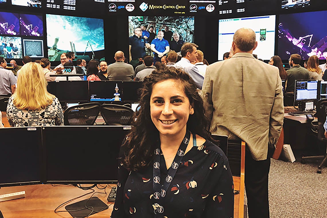 Kristen Facciol in the Mission Control Center of NASA’s Johnson Space Center. Facciol has become the 14th Canadian to earn a CSA/NASA Robotics Flight Controller Certification (photo courtesy of Kristen Facciol/NASA)
