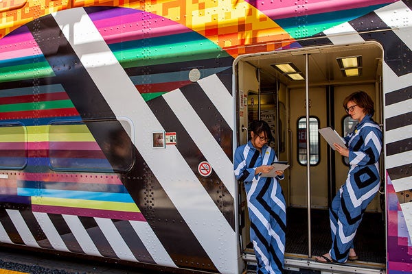 Multi-media artists Jennifer Marman and Daniel Borins designed the train car exterior that features an abstract, brightly coloured vinyl wrap, while inside, posters and ceiling vinyl will have a similar look and feel to the exterior graphic.
