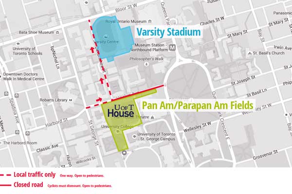 To navigate the downtown campus, visitors need to know that Hoskin Avenue between Devonshire Place and Queen’s Park (behind the Pan Am/ Parapan Am Fields) will be closed to vehicles until August 22. Devonshire Place is only open (northbound) for Toronto 2015 Pan Am/ Parapan Am Games vehicles and staff or deliveries to the surrounding U of T buildings. The sidewalk on the north side of Hoskin will be open to pedestrians and cyclists who dismount and walk their bikes. No other roads are closed to motor vehicles on the downtown campus.