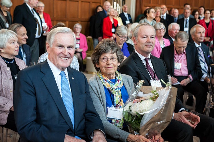 Michael Wilson's family – his wife Margie and son Geoff – attended May's event at Hart House, a tribute to the U of T chancellor. (photo by Lisa Sakulensky)