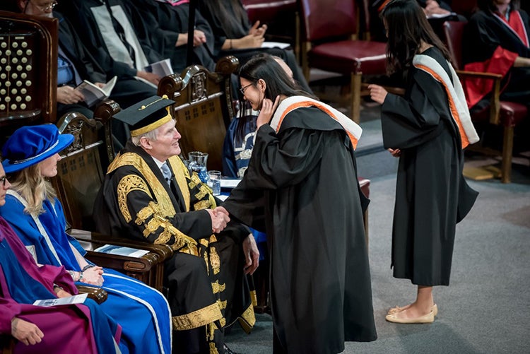 Wilson greets graduating students at Thursday's convocation of Rotman Commerce (photo by Steve Frost)