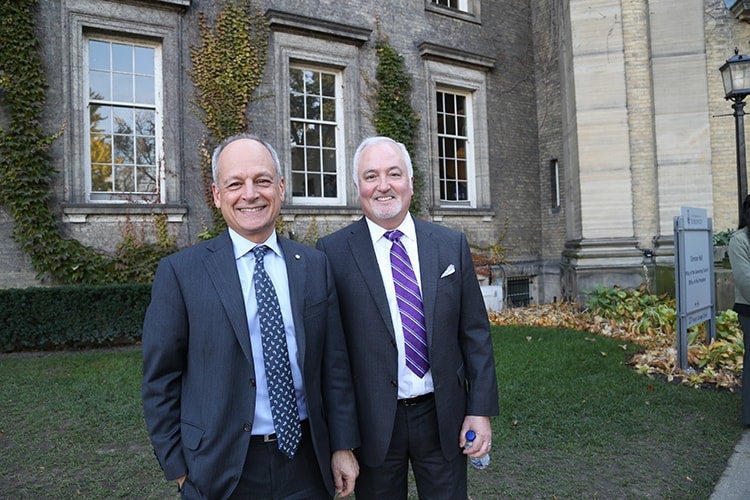 U of T President Meric Gertler (left) greets GM Canada head Steve Carlisle (right) during his visit to U of T's downtown Toronto campus