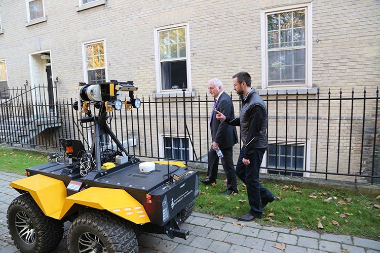 As part of his visit here, Carlisle met with Professor Tim Barfoot of U of T's Institute for Aerospace Studies (UTIAS) and Canada Research Chair in autonomous space robotics, who provided a demonstration of one of the institute’s autonomous robots on campus.