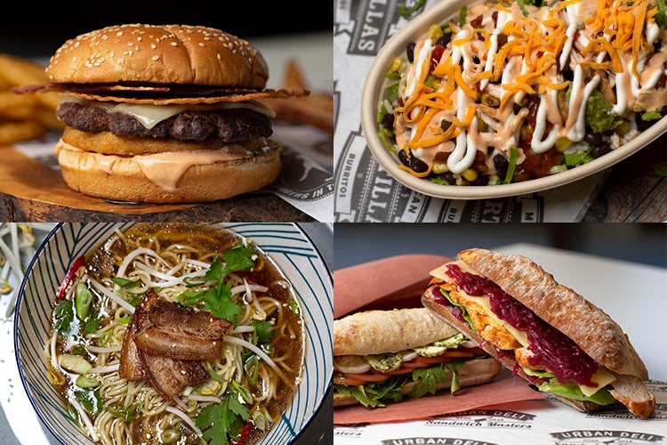 Bacon cheddar burger, burrito bowl, deli sandwiches and pork ramen (photos by Jackie Shapiro/Ancillary Services)