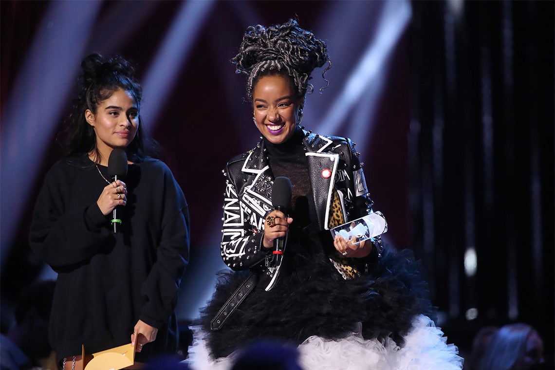 Amanda Parris receives the Fans Choice Award for Avril Lavigne who was absent as Jessie Reyez (left) looks on during the 2019 Juno Awards in London, Ont. (photo by Tom Szczerbowski via Getty Images)