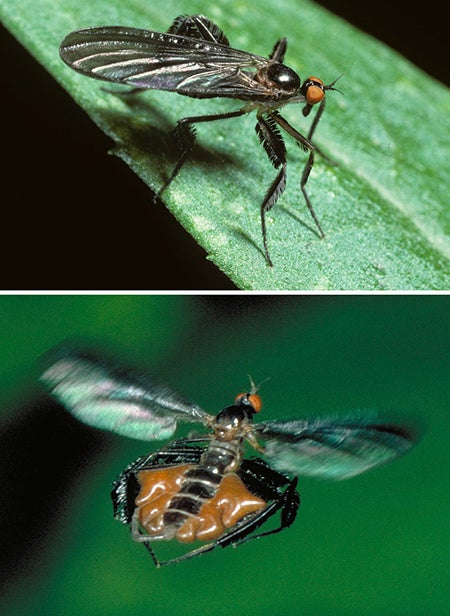 Murray says there are two theories about why large sexual ornaments have developed among the female dance flies. The large abdomens and leg scales may honestly signal that the females have the most or largest eggs and are the best bet for the male to father the most offspring. Alternatively, they may serve as a symbol of sexual conflict between the sexes: All of the females want to attract males, but large abdominal sacs and/or large leg scales may be deceiving males about the number and size of eggs available for fertilization within a female.