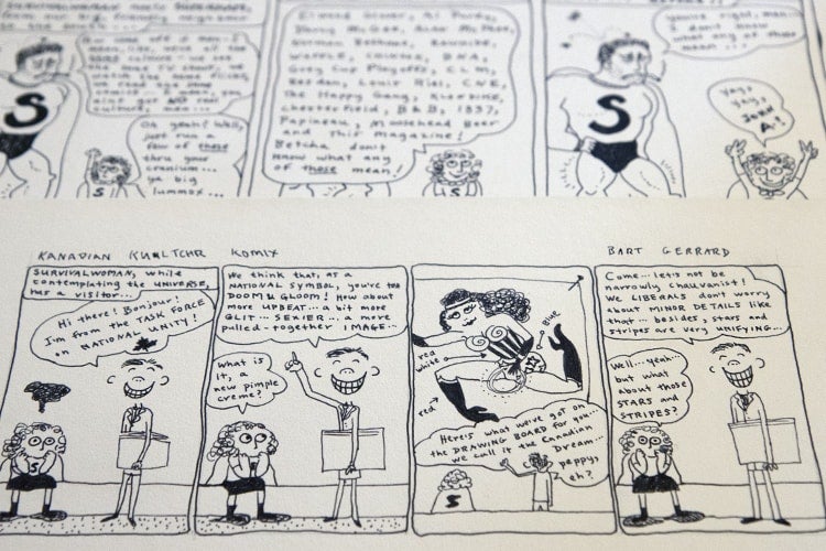 Fisher Library also has the playbills Atwood illustrated and printed while at Victoria College and comics she’s drawn over the years under the pseudonym Bart Gerrard – many of which have never been published.
