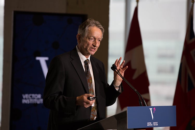 Geoffrey Hinton, known as the “godfather of deep learning,” speaks at the launch of the Vector Institute for Artificial Intelligence in 2017 (photo by Lisa Lightbourn)