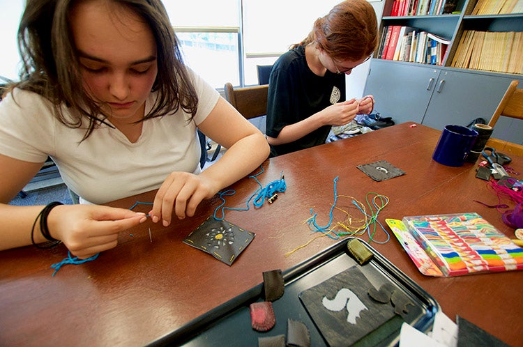 Students Giovanna Batti and Scarlet Lowrie try their hand at some traditional crafting techniques during a sewing activity (photo by Diana Tyszko)