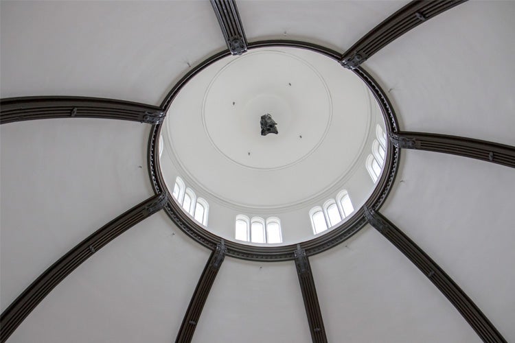 Inside the Croft Chapter House, the darkened dome is now a bright white (pictured above), with carved wood beams meeting below a halo of windows. This where the Paul Cadario Conference Centre will be located – a modular space allowing for different types of gatherings.