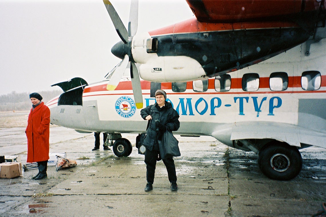 Lynne Viola, pictured arriving in Arkhangelsk, Russia in the late 1990s, is celebrated for archival research into the Stalinist era that provided revelations about perpetrators of violence and gave a voice to the oppressed (photo courtesy of Lynne Viola)