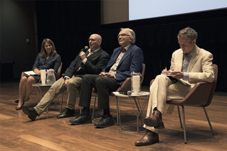 Shauna Brail, U of T’s presidential adviser on urban engagement and director of the urban studies program, moderated a panel that included Ken Gibb, professor at the University of Glasgow, David Hulchanski, professor at U of T's Factor-Inwentash Faculty of Social Work, and Hal Pawson, professor at the University of New South Wales (photo by Romi Levine)