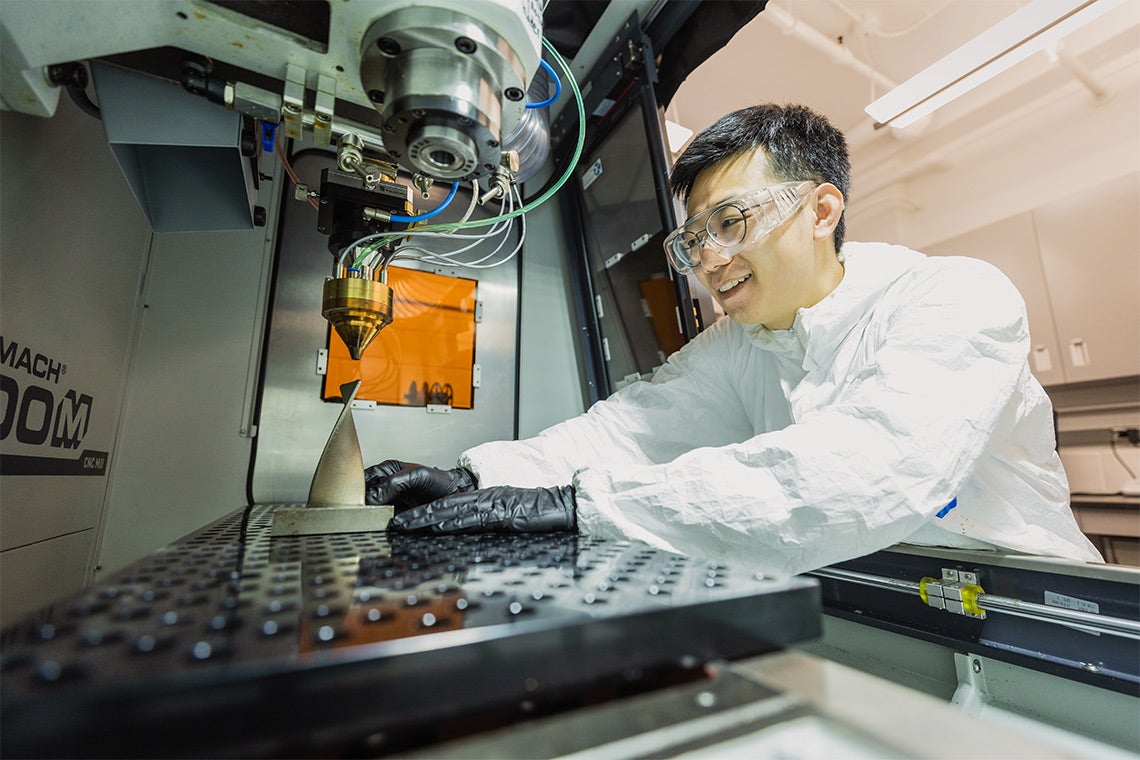 PhD candidate Xiao Shang works with a metal 3D printer in Assistant Professor Yu Zou’s lab (photo by Neil Ta)