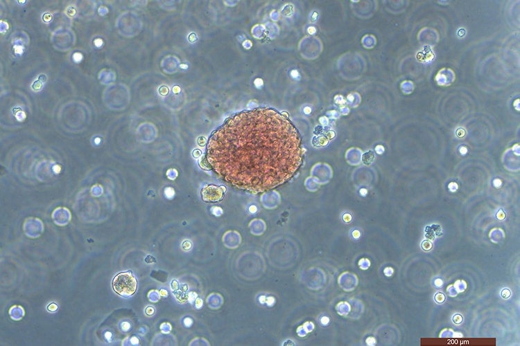 Researchers derived this colony of red blood cells from pluripotent stem cells (photo by Jelena Tomic)