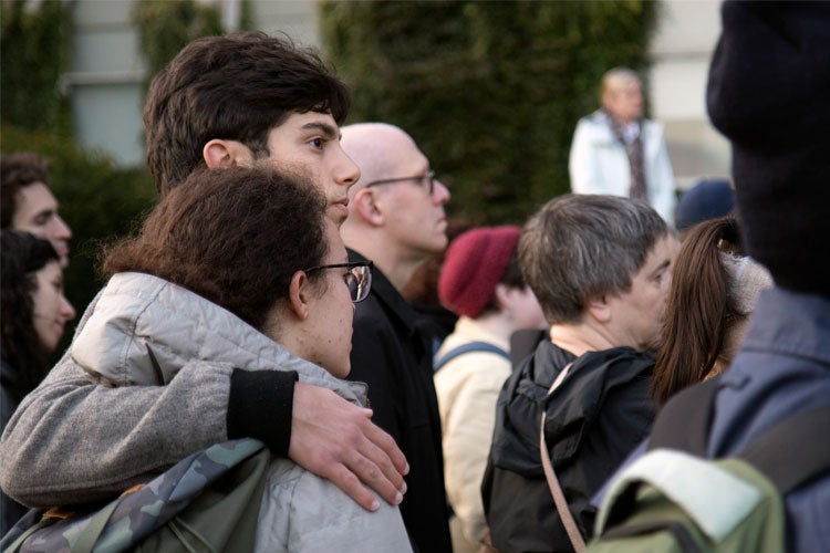 “The outpouring of support from so many partners and friends on campus since Saturday makes me feel less alone and less scared,” said Aaron Rotenberg, interim director of Hillel at U of T. “Seeing all of you here gathering, mourning, reflecting with us makes me feel less alone and less scared. Thank you. Thank you for being here.”