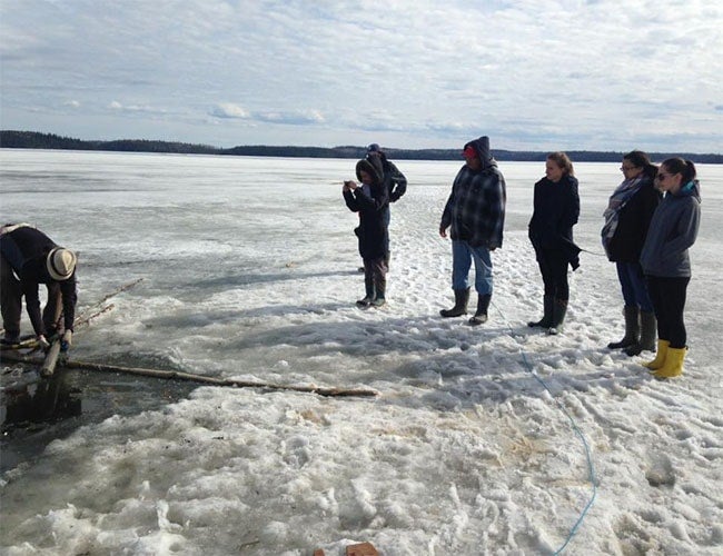 U of T Let's Talk Science volunteers experience ice fishing in Sandy Lake (photo by Elliot Fiddler)