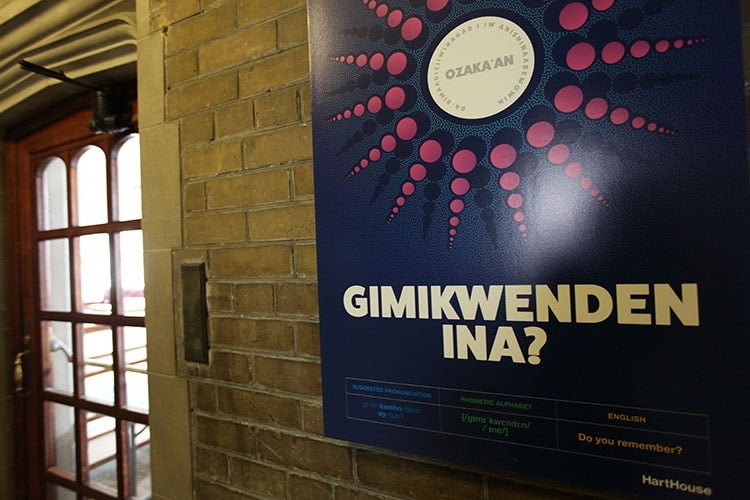 Visitors walking along the first-floor corridor at Hart House can learn phrases such as “Gii-kashkadin i’iw zaaga’igan gii-kisinaag,” meaning “The lake froze over when it got cold,” or “Giminadan gagiginonshiwan,” meaning “It was nice talking to you.”