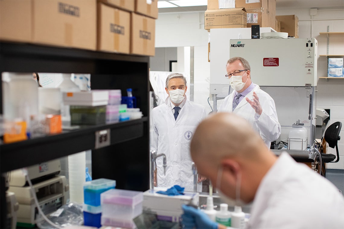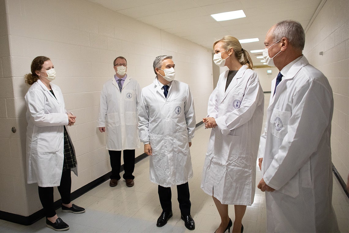 The visit included a meeting with U of T President Meric Gertler, a look at the massive geoexchange field that’s being built on Front Campus as part of the Landmark Project and a tour of U of T’s Combined Containment Level 3 (C-CL3) lab, which conducts critical research and validation on various infectious diseases, including COVID-19.