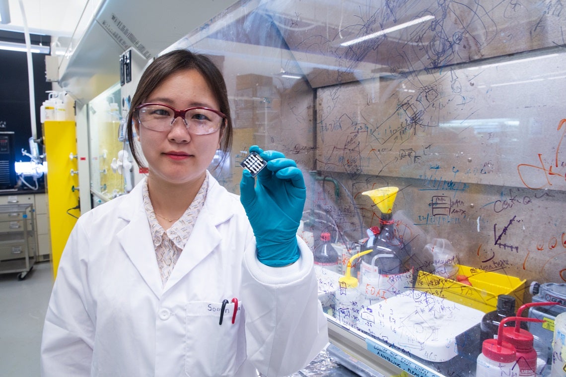 Postdoctoral fellow So Min Park holds up a sample of the perovskite solar cell that she and her collaborators designed (photo by Tyler Irving)